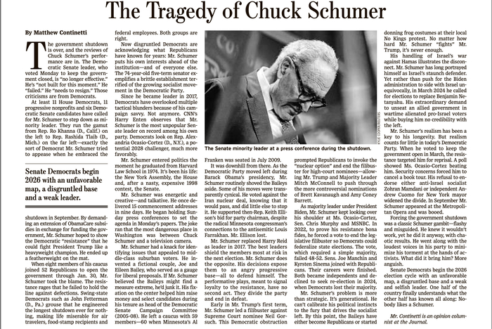 Nov 13, 2025 update: Matthew Continetti's article on "The Tragedy of Chuck Schumer" ends with "Nobody likes a Schumer." He accurately portrays Schumer as a careerist with no convictions who has mastered the art of triangulation.