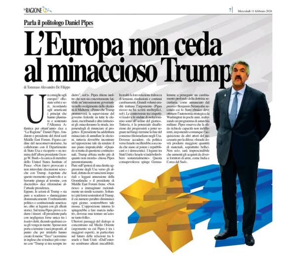 Do you have advice for European leaders? Daniel Pipes, founder of the Middle East Forum think tank, tells La Ragione, "Stay sober and serious, keep reminding Europeans and Americans of the principles that have shaped and sustained the Atlantic Alliance for eighty years."