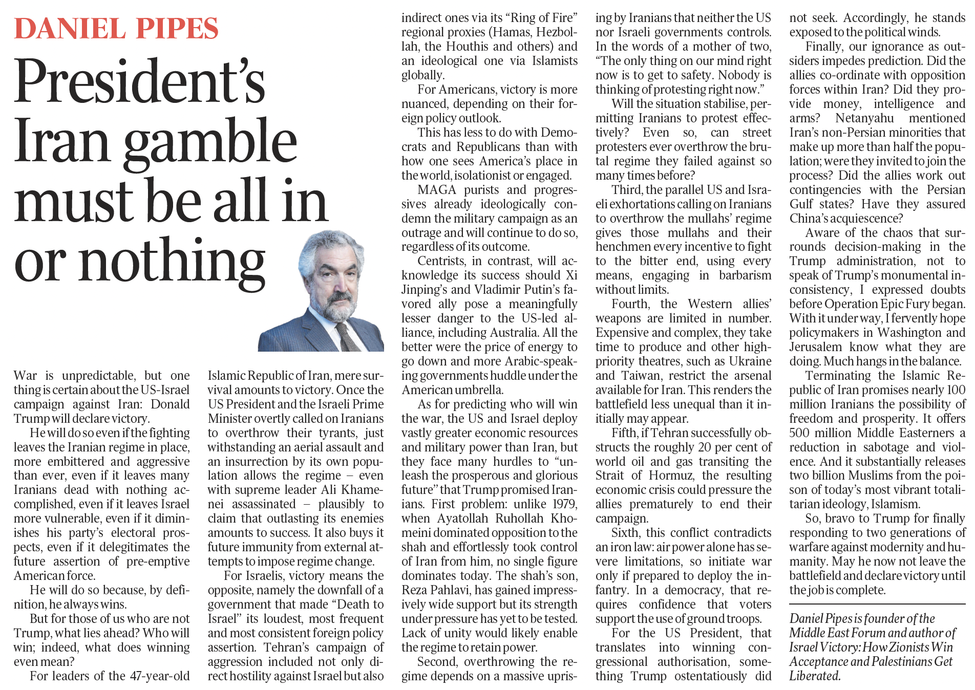 For Americans, victory is more nuanced, depending on their foreign policy outlook. This has less to do with Democrats and Republicans than with how one sees America's place in the world, isolationist or engaged. MAGA purists and progressives already ideologically condemn the military campaign as an outrage and will continue to do so, regardless of its outcome. Centrists, in contrast, will acknowledge its success should Xi Jinping's and Vladimir Putin's favored ally pose a meaningfully lesser danger to the U.S.-led alliance, including Australia. All the better were the price of energy to go down and more Arabic-speaking governments huddle under the American umbrella.