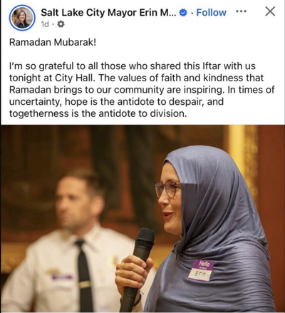 Mar. 21, 2026 update: Salt Lake City's Mayor Erin Mendenhall wore an especially tight hijab as she hosted Muslims for an iftar at City Hall.
